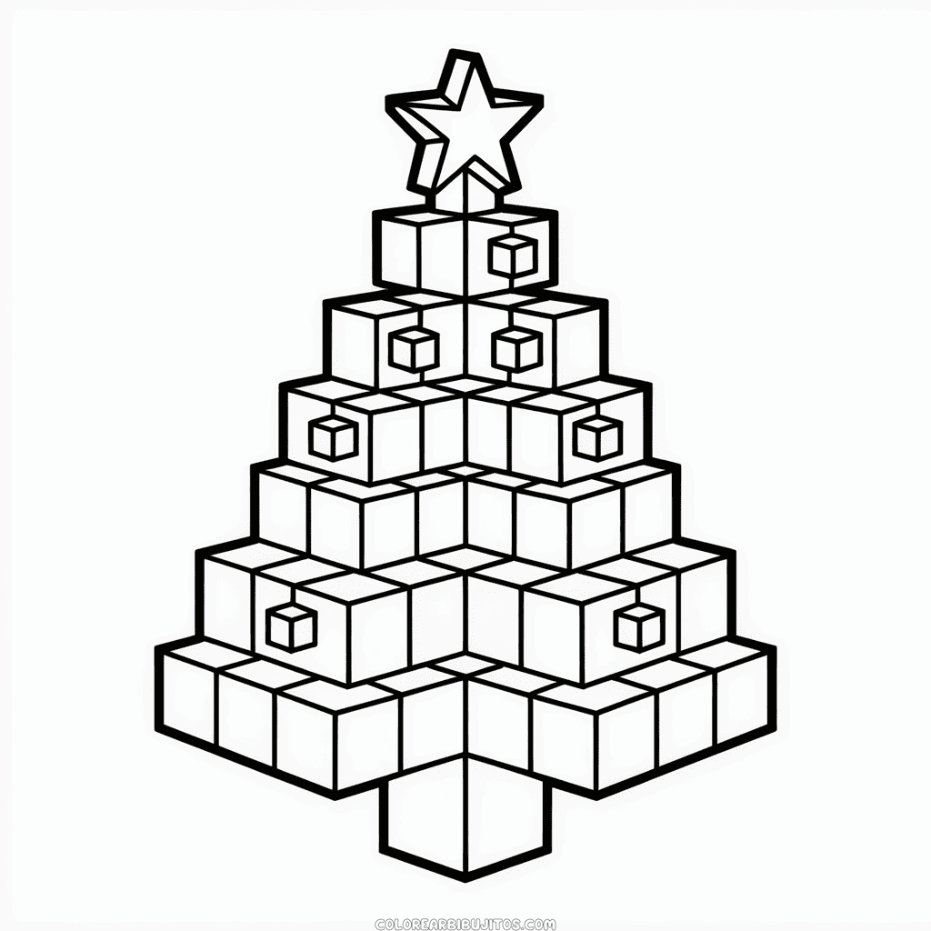 Dibujo para colorear gratis de Árbol de Navidad Minecraft, esta ilustración presenta un árbol navideño en el icónico estilo pixelado de Minecraft. Imprime y colorea gratis este dibujo de Árbol de Navidad Minecraft para niños. Imagen PNG de alta calidad, en blanco y negro, optimizada para imprimir en PDF formato A4.