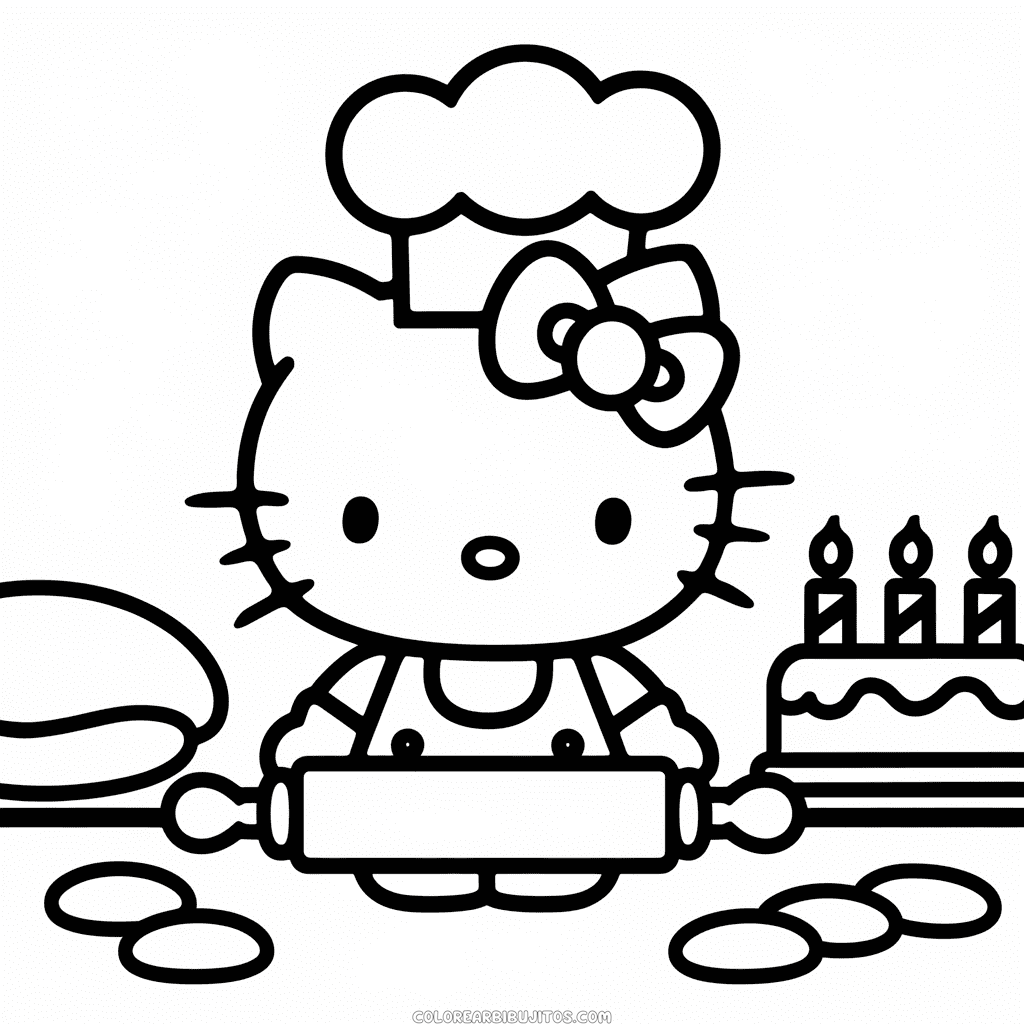 Dibujo para colorear gratis de Hello Kitty horneando, muestra a la encantadora gatita en la cocina mientras prepara deliciosos pasteles. Imprime y colorea gratis este dibujo de Hello Kitty horneando para niños. Imagen PNG de alta calidad, en blanco y negro, optimizada para imprimir en PDF formato A4.