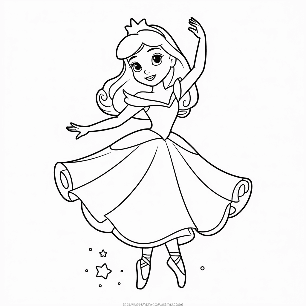 Dibujo para colorear gratis de Princesa Disney Bailarina, una elegante ilustración de una princesa de Disney en una pose de ballet clásico. Imprime y colorea gratis este dibujo de Princesa Disney Bailarina para niños. Imagen PNG de alta calidad, en blanco y negro, optimizada para imprimir en PDF formato A4.