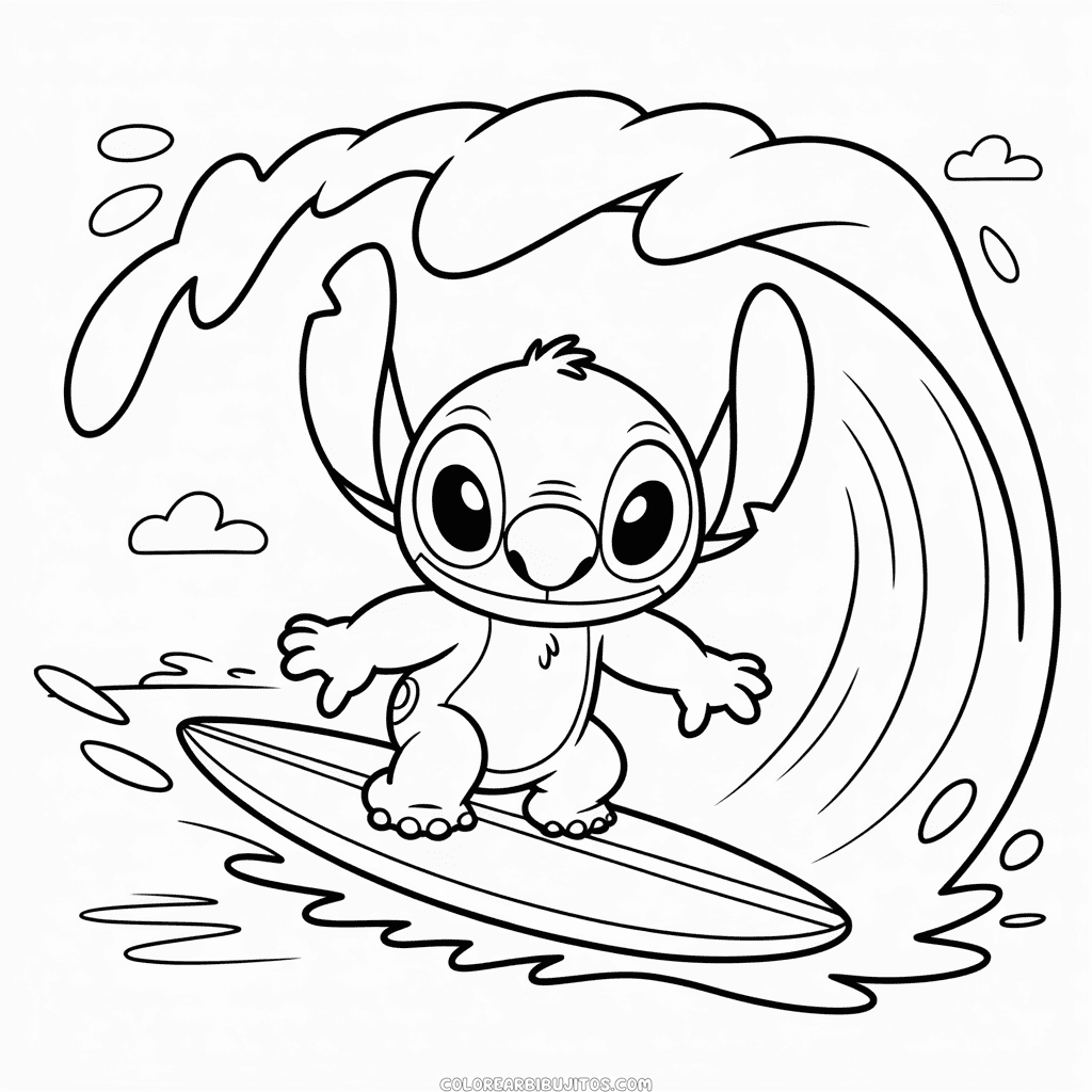 Dibujo para colorear gratis de Stitch haciendo surf, muestra al simpático extraterrestre disfrutando de una emocionante aventura sobre las olas. Imprime y colorea gratis este divertido dibujo de Stitch haciendo surf para niños. Imagen PNG de alta calidad, en blanco y negro, optimizada para imprimir en PDF formato A4.