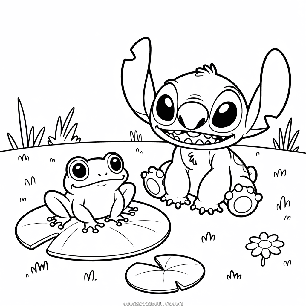 Dibujo para colorear gratis de Stitch y la Rana, una adorable escena donde el divertido Stitch se encuentra con una pequeña rana. Imprime y colorea gratis este dibujo de Stitch y la Rana para niños. Imagen PNG de alta calidad, en blanco y negro, optimizada para imprimir en PDF formato A4.