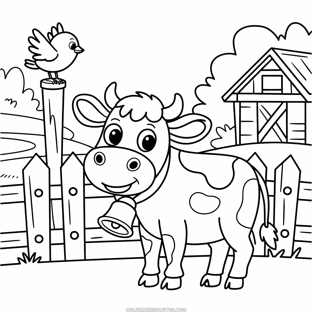 Dibujo para colorear gratis de Vaca en una Granja, muestra una adorable vaca posando en su entorno rural, rodeada de campos verdes y el cielo abierto de la granja. Imprime y colorea gratis este dibujo de Vaca en una Granja para niños. Imagen PNG de alta calidad, en blanco y negro, optimizada para imprimir en PDF formato A4.