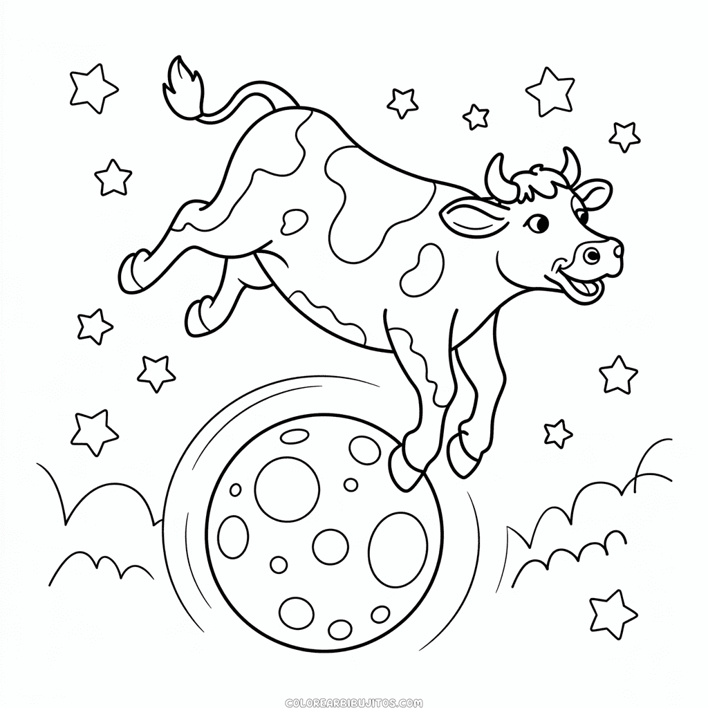 Dibujo para colorear gratis de Vaca Saltando Sobre la Luna, una escena divertida donde una simpática vaca está en pleno salto encima de la luna, estimulando la imaginación y creatividad de los niños. Imprime y colorea gratis este dibujo de Vaca Saltando Sobre la Luna para niños. Imagen PNG de alta calidad, en blanco y negro, optimizada para imprimir en PDF formato A4.
